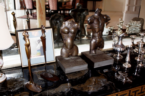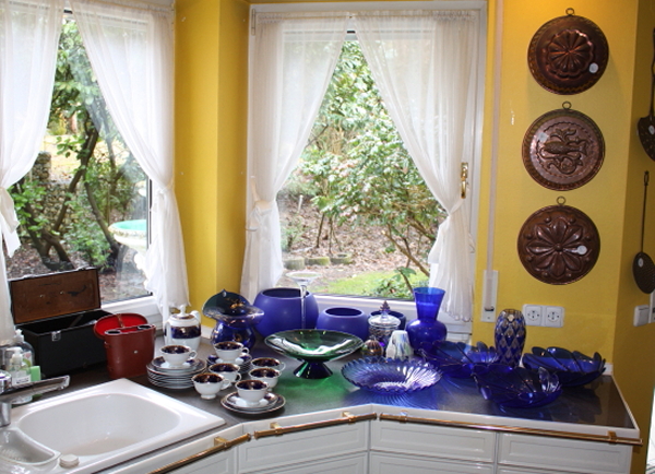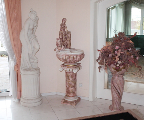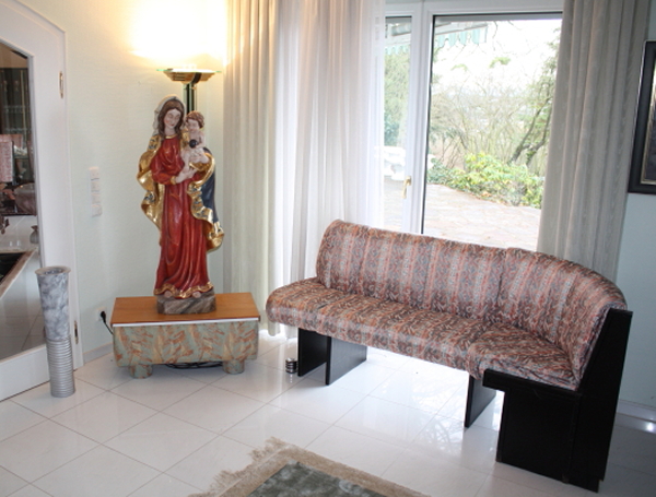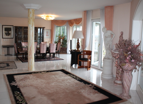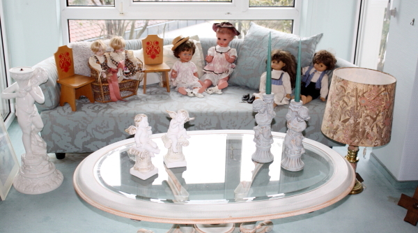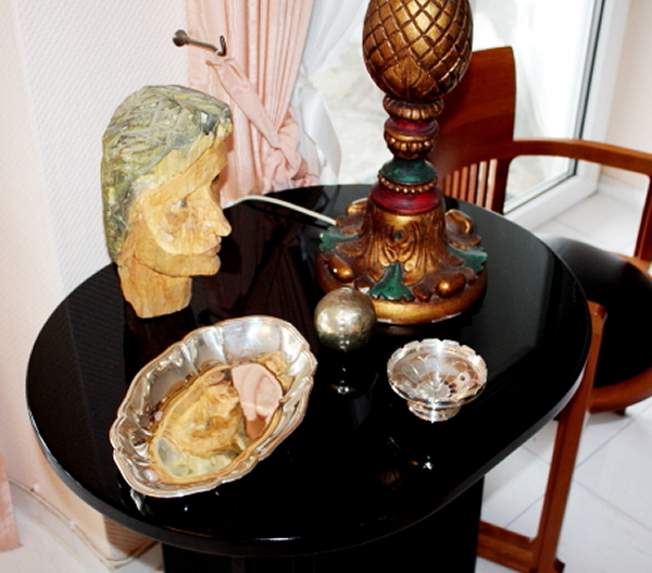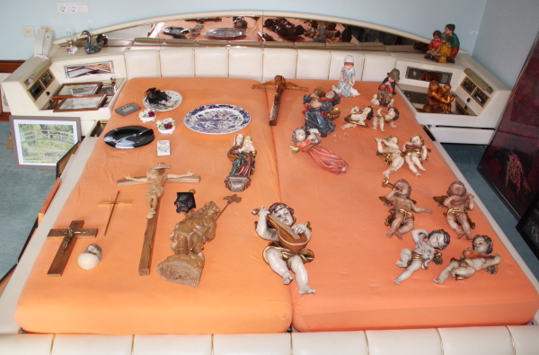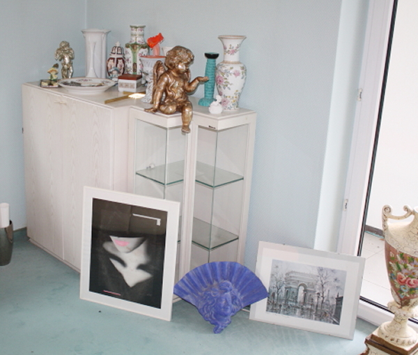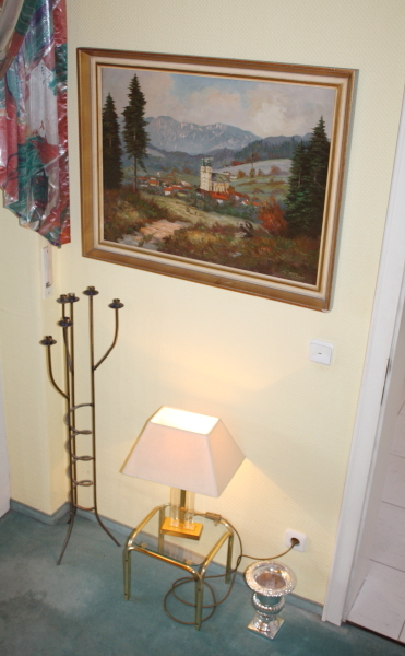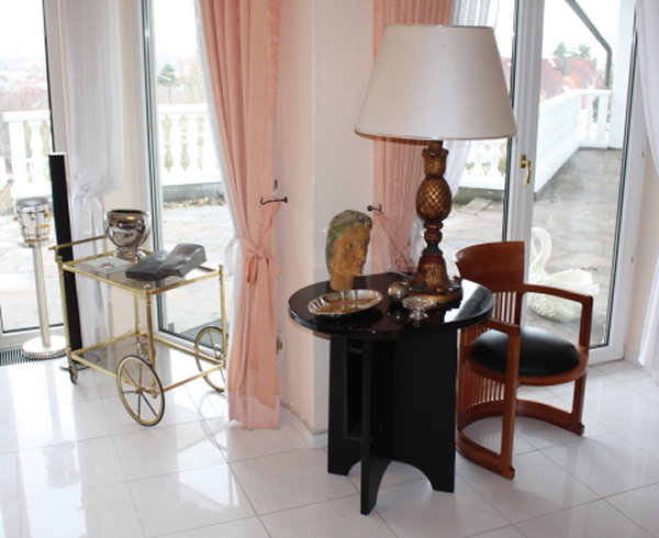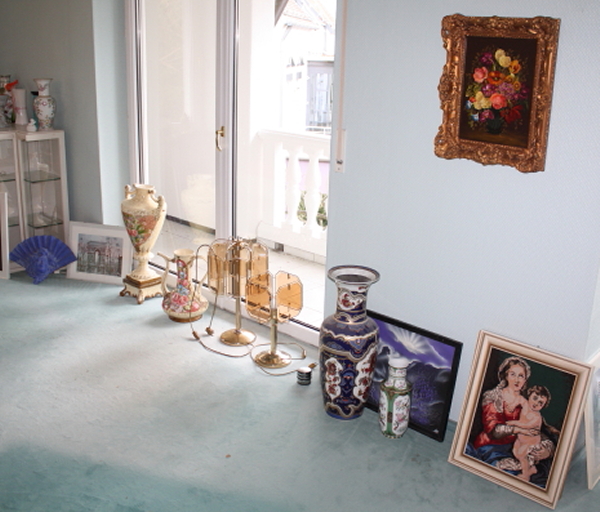 die exklusive Einrichtung, Teppiche und Brücken, Decken-, Steh- und Tischlampen, Spiegel und Textilien. Gemälde und Graphik, Skulpturen. Porzellan (Meissen, Rosenthal, Hutschenreuther, V&B) und einige Teile Silber. Glas, Kupfer und Kunsthandwerk (viele Engel), Puppen. TV, HiFi, CD, Platten. Exquisite, umfangreiche Gartendekorationen.